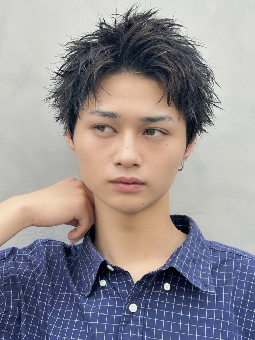 それでも浮きやすい場合は、スパイキーショートがおすすめ。縦の動きとシルエットを整えることで、面長を自然にカモフラージュできます。短髪でもバランスよく、扱いやすいメンズショートに。気になる方はご相談ください。